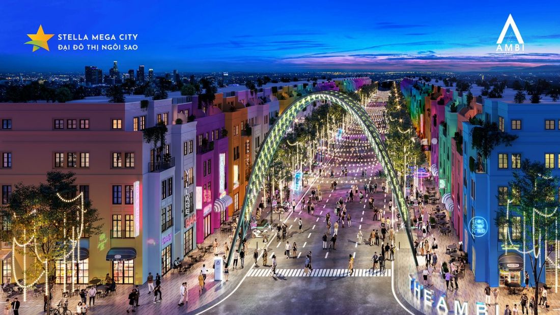 Phối cảnh dãy shophouse đại lộ Ánh Sáng của khu đô thị Ngôi Sao Stella Mega City đang mở bán với nhiều chính sách ưu đãi. Đây là những sản phẩm kết hợp ở và kinh doanh rất nhiều tiềm năng nên thu hút nhiều nhà đầu tư quan tâm.