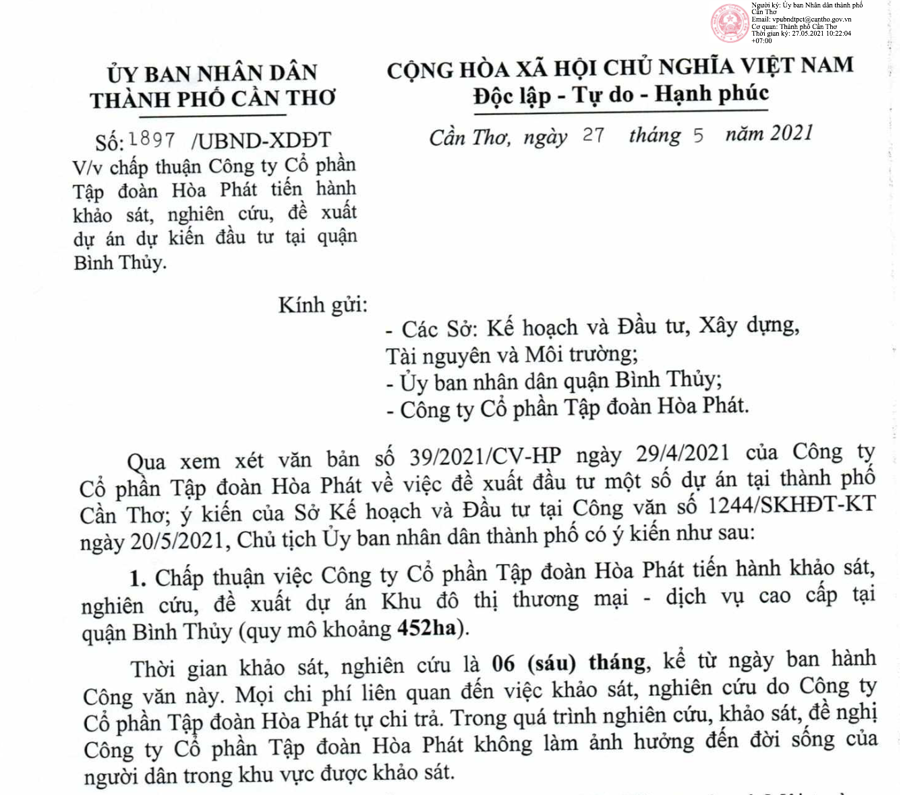 Ngày 27/5, UBND thành phố Cần Thơ vừa ban hành công văn chấp thuận việc Công ty Cổ phần Tập đoàn Hòa Phát tiến hành khảo sát, nghiên cứu, đề xuất đầu tư dự án khu đô thị thương mại dịch vụ cao cấp trên tại quận Bình Thủy với quy mô khoảng 452ha.